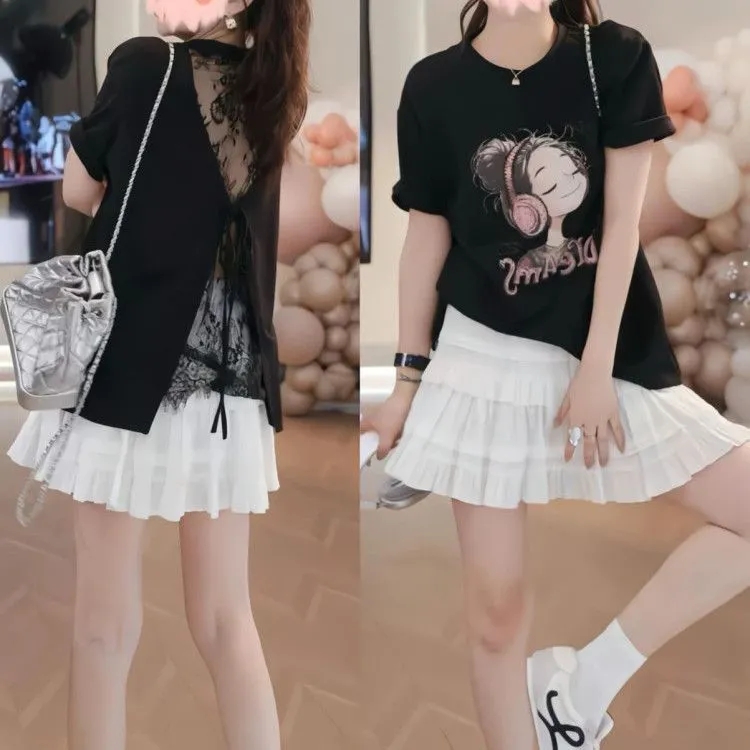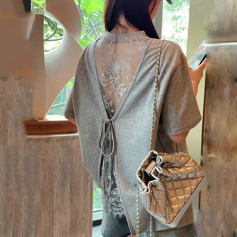 2026韓系女夏新款獨特T卹別緻卡通燙鑽印花短袖寬鬆後背鏤空蕾絲上衣
